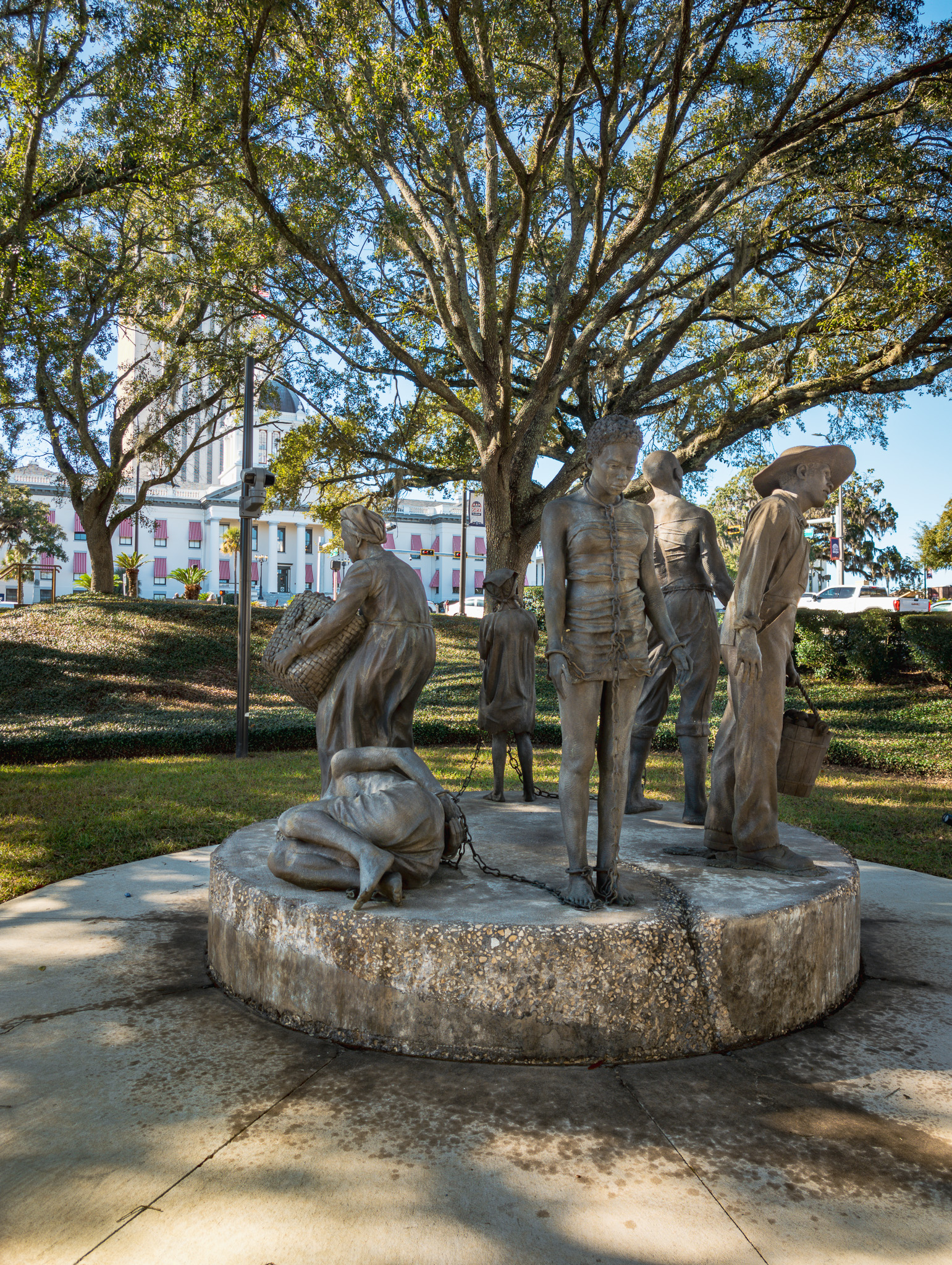 Located next to the historic Union Bank and in the shadow of the Florida Capitol, this powerful bronze sculpture by artist Steven Whyte encourages viewers to reflect on the history of slavery in America. The artwork features six life-sized figures, each representing a different experience of enslavement. Despite their diverse ages and backgrounds, the figures are interconnected by a single chain, symbolizing the shared reality of forced servitude. Unveiled on April 28, 2025, “Circle of Chains” serves as a place of remembrance, education, and reflection for the local community and beyond.