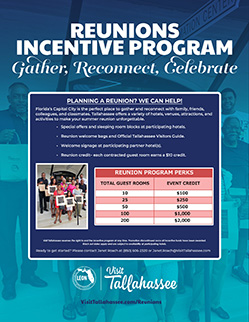 The Reunions Incentive Program: Gather, Reconnect, Celebrate offers perks for reunion groups who book sleeping rooms and hold a reunion in Tallahassee during May, June, July or August 2026. The more sleeping rooms booked the more benefits received.